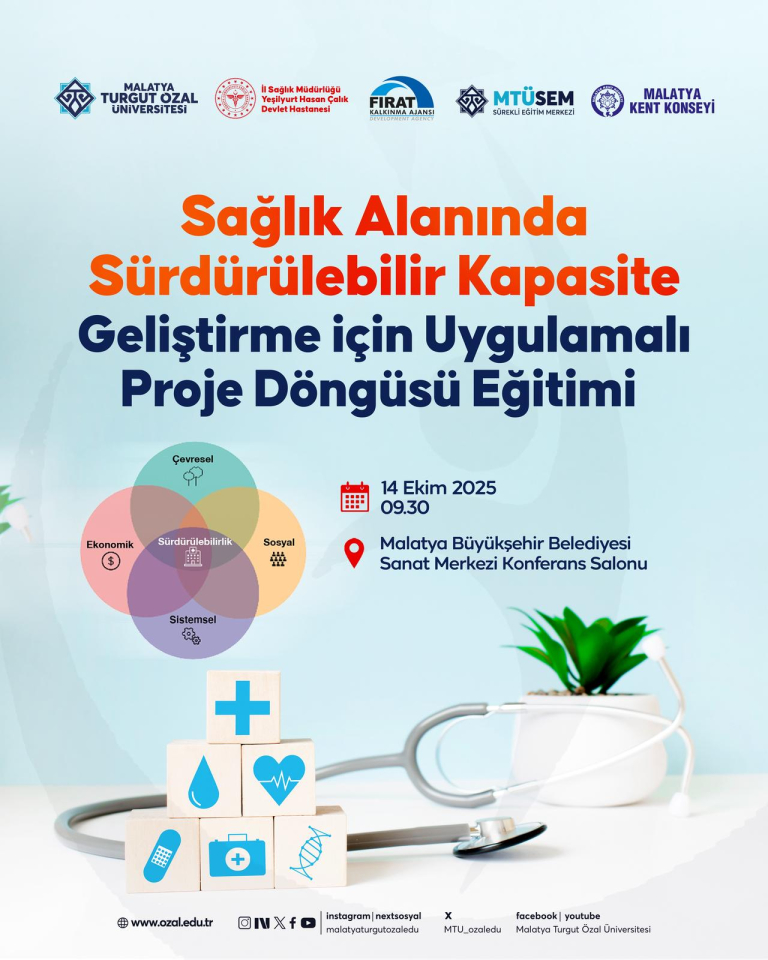 Malatya Hasan Çalık Devlet hastanesi tarafından hazırlanan ve Fırat Kalkınma Ajansı tarafından 2025 Yılı Yönetim Danışmanlığı Teknik Destek Programı kapsamında desteklenen "Sağlık Alanında Sürdürülebilir Kapasite Geliştirme için Uygulamalı Proje Döngüsü Eğitimi" Malatya Kent Konseyi eğitim salonunda 14-17 Ekim 2025 tarihleri arasında gerçekleştirilecektir. Malatya Turgut Özal Üniversitesi Sürekli Eğitim Merkezi tarafından koordine edilen eğitim programına kayıt için https://mtusem.ozal.edu.tr/ adresini ziyaret edebilirsiniz.